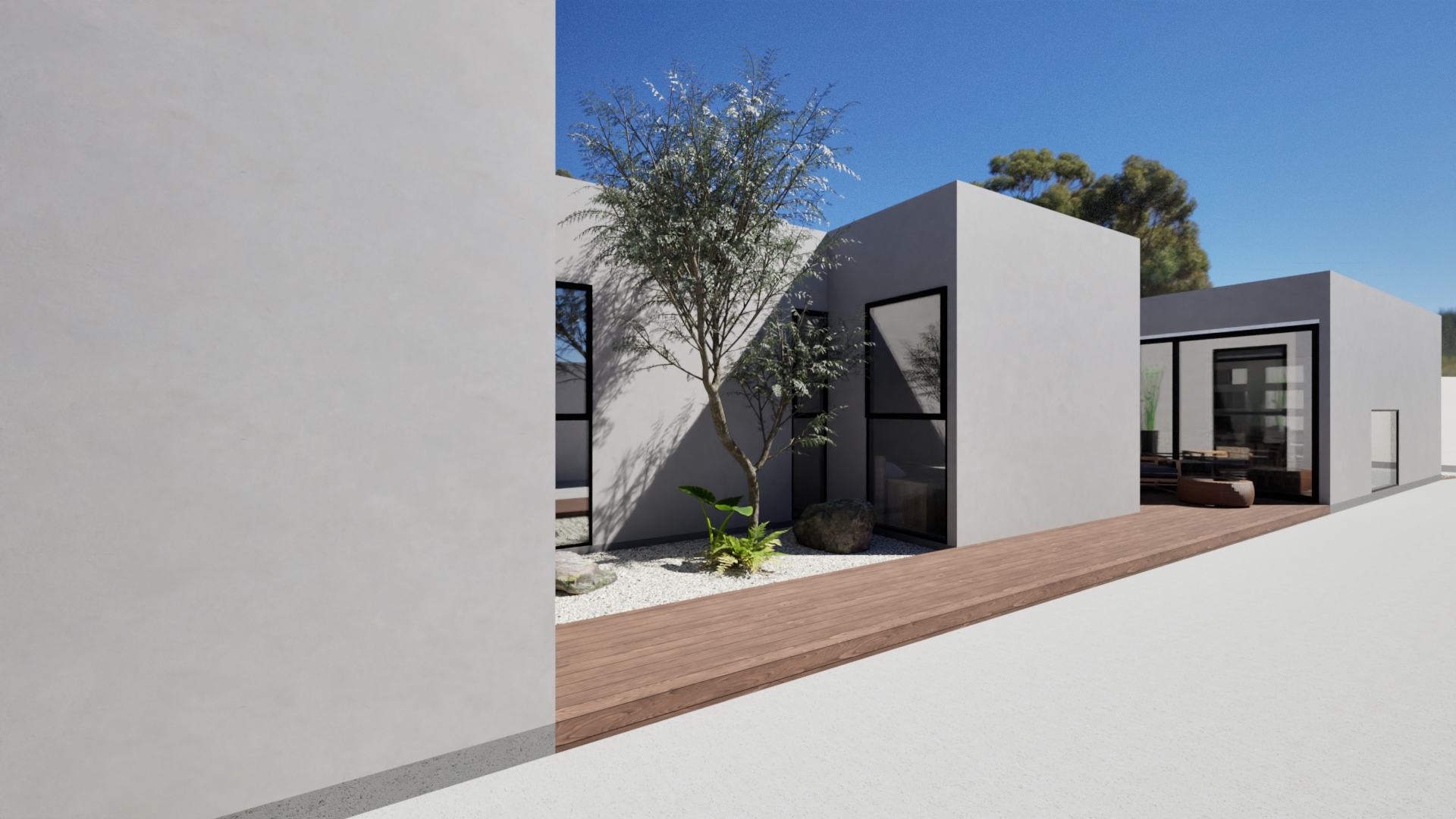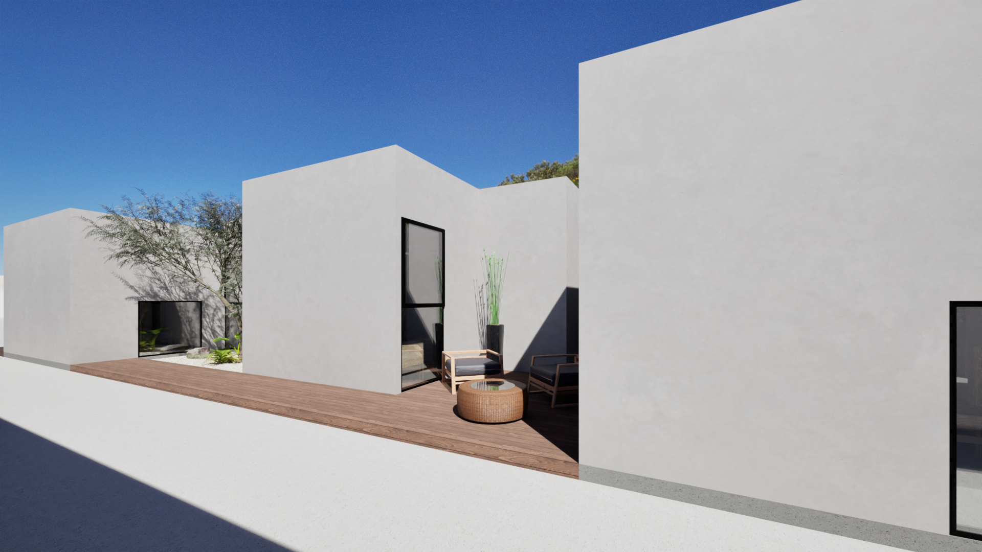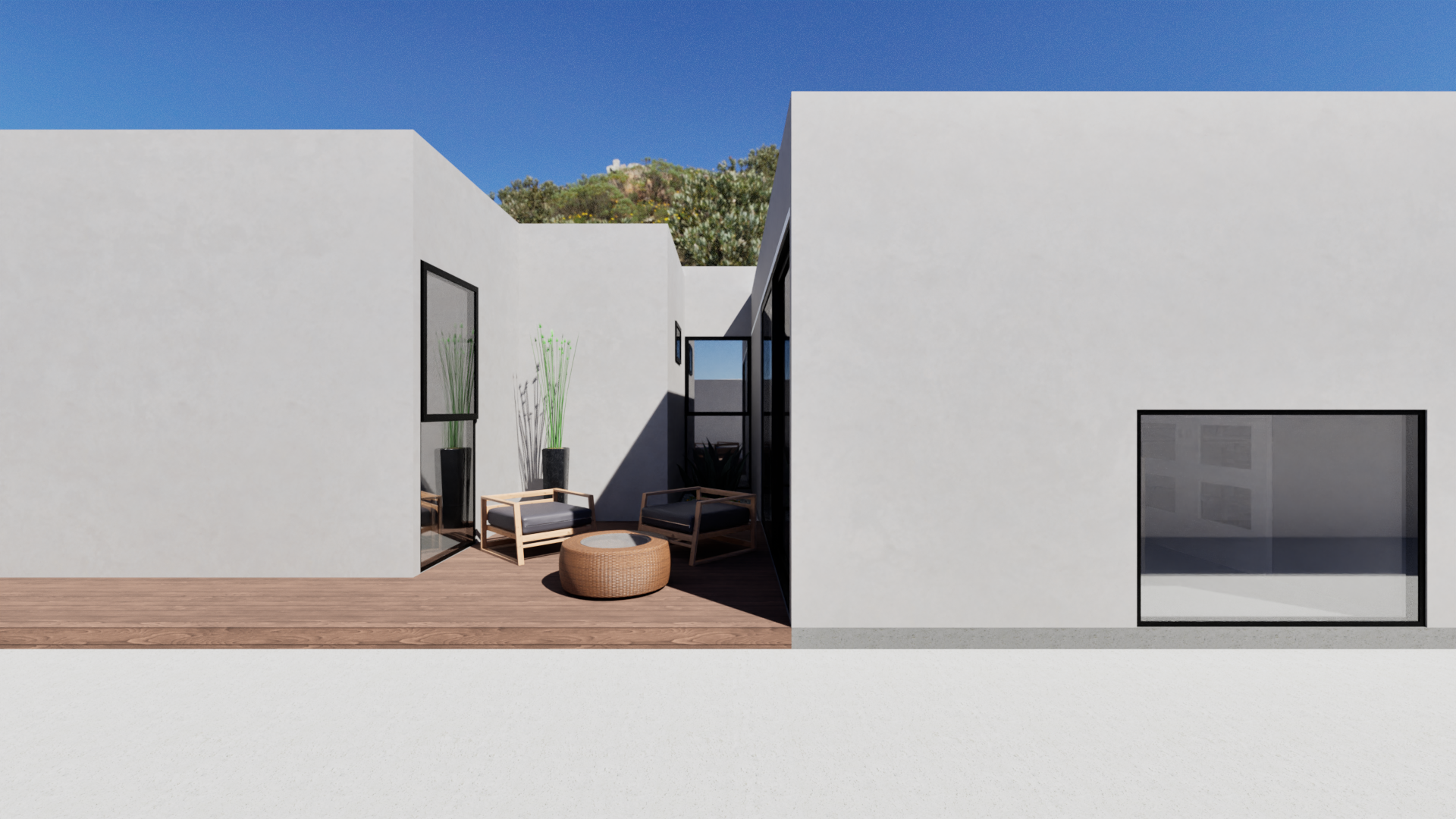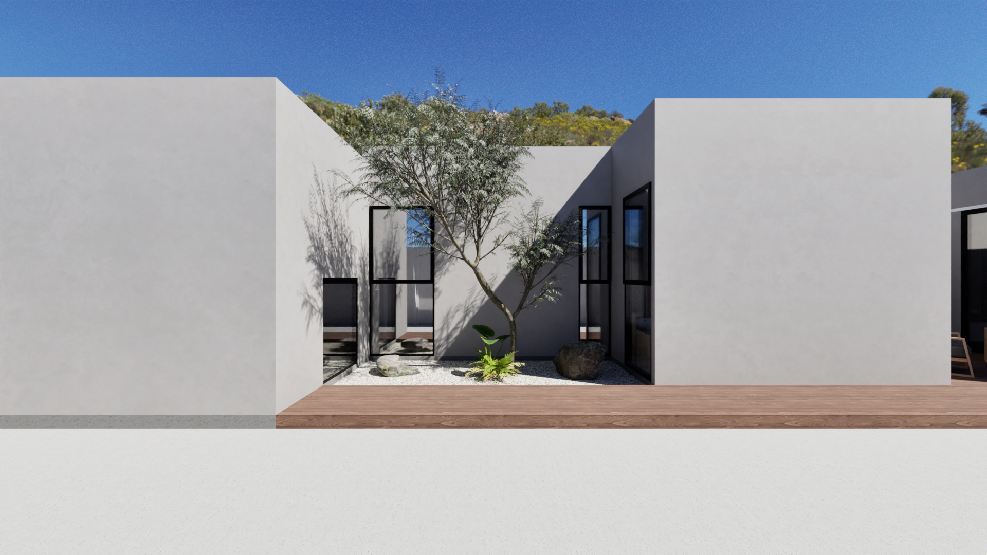 La casa se organiza como un conjunto de volúmenes mínimos, dispuestos en torno a patios y vacíos cuidadosamente orientados. En lugar de construir un bloque compacto, se optó por fragmentar el programa en piezas independientes, generando entre ellas espacios intermedios de descanso, contemplación y sombra. Este gesto no solo permite una ventilación cruzada natural, sino que promueve una arquitectura que respira y dialoga con el clima seco y soleado de la zona.